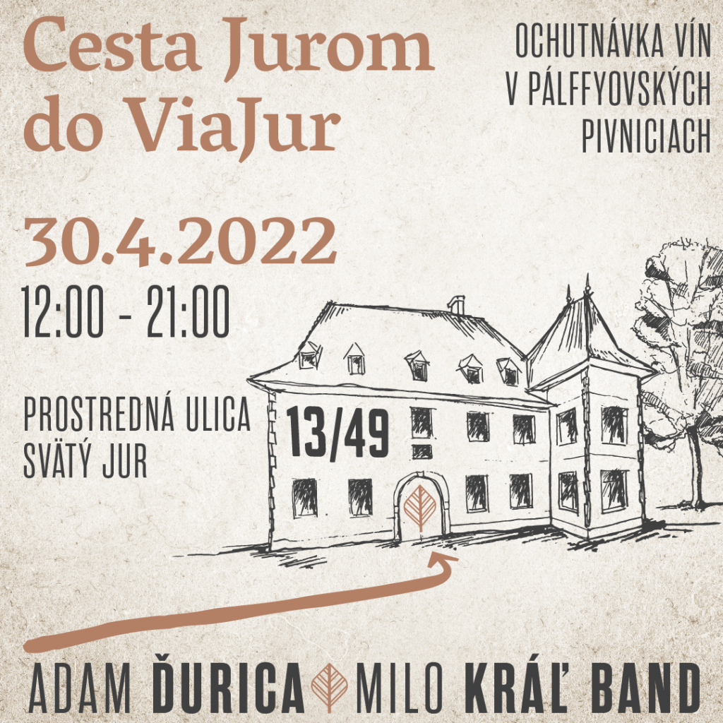 Pozývame vás na exkluzívny 1. ročník vinárskeho podujatia moderného progresívneho vinárstva ViaJur. Vinárstvo ViaJur otvára brány pálffyovských pivníc, v ktorých uvidíte neobyčajné prepojenie historických priestorov pivnice s modernou časťou. Výroba vína sa v impozantných priestoroch pivníc Kaštieľa Pálffy v Svätom Jure začala pred viac ako 600 rokmi.