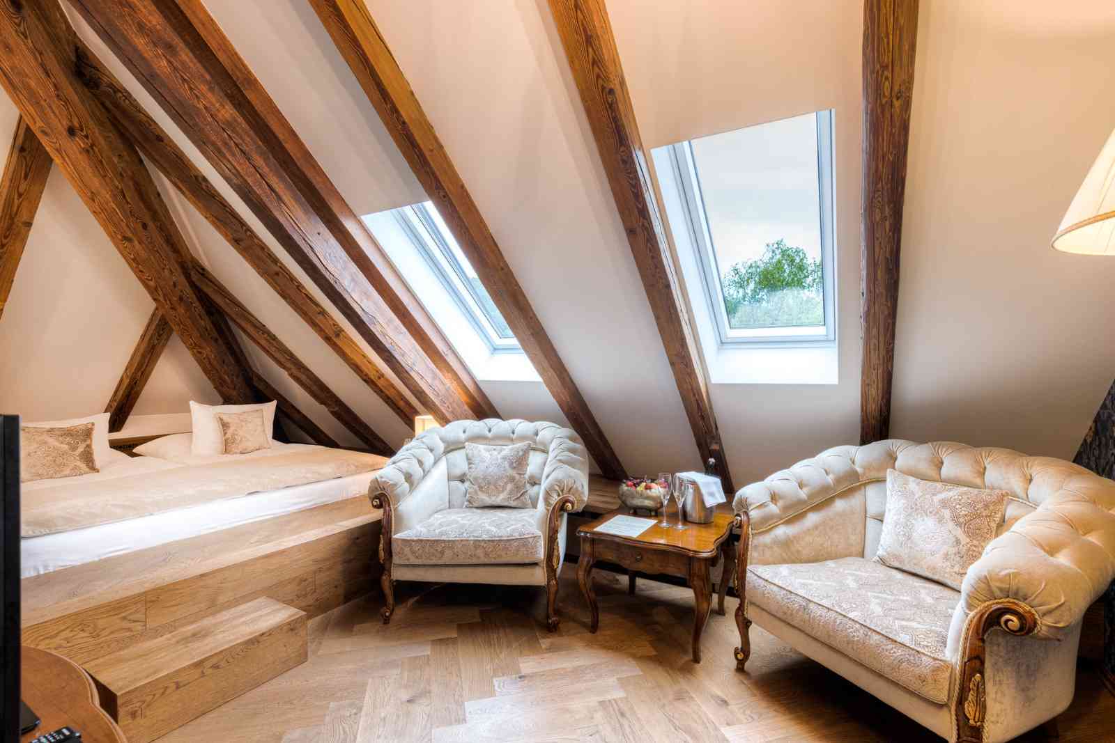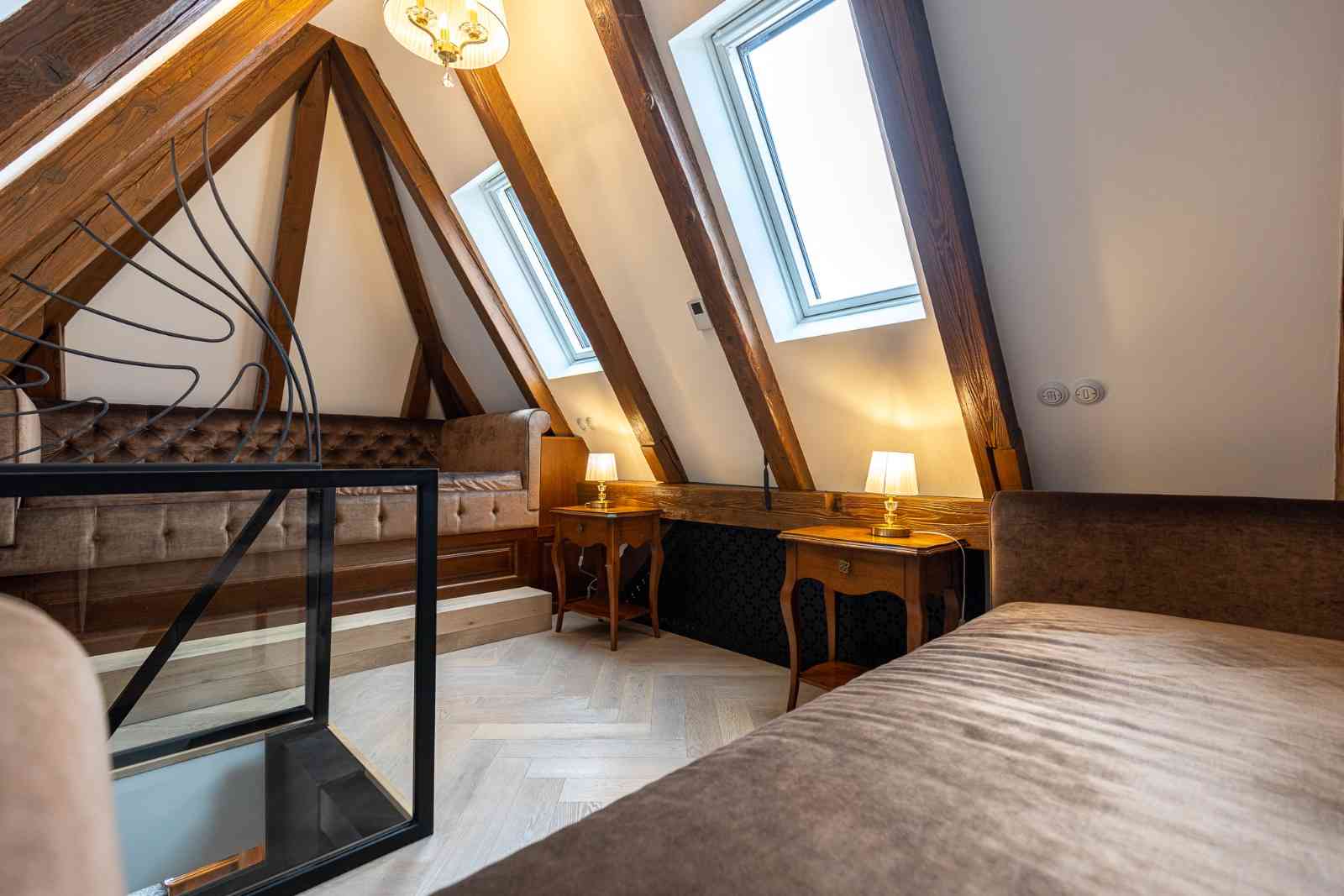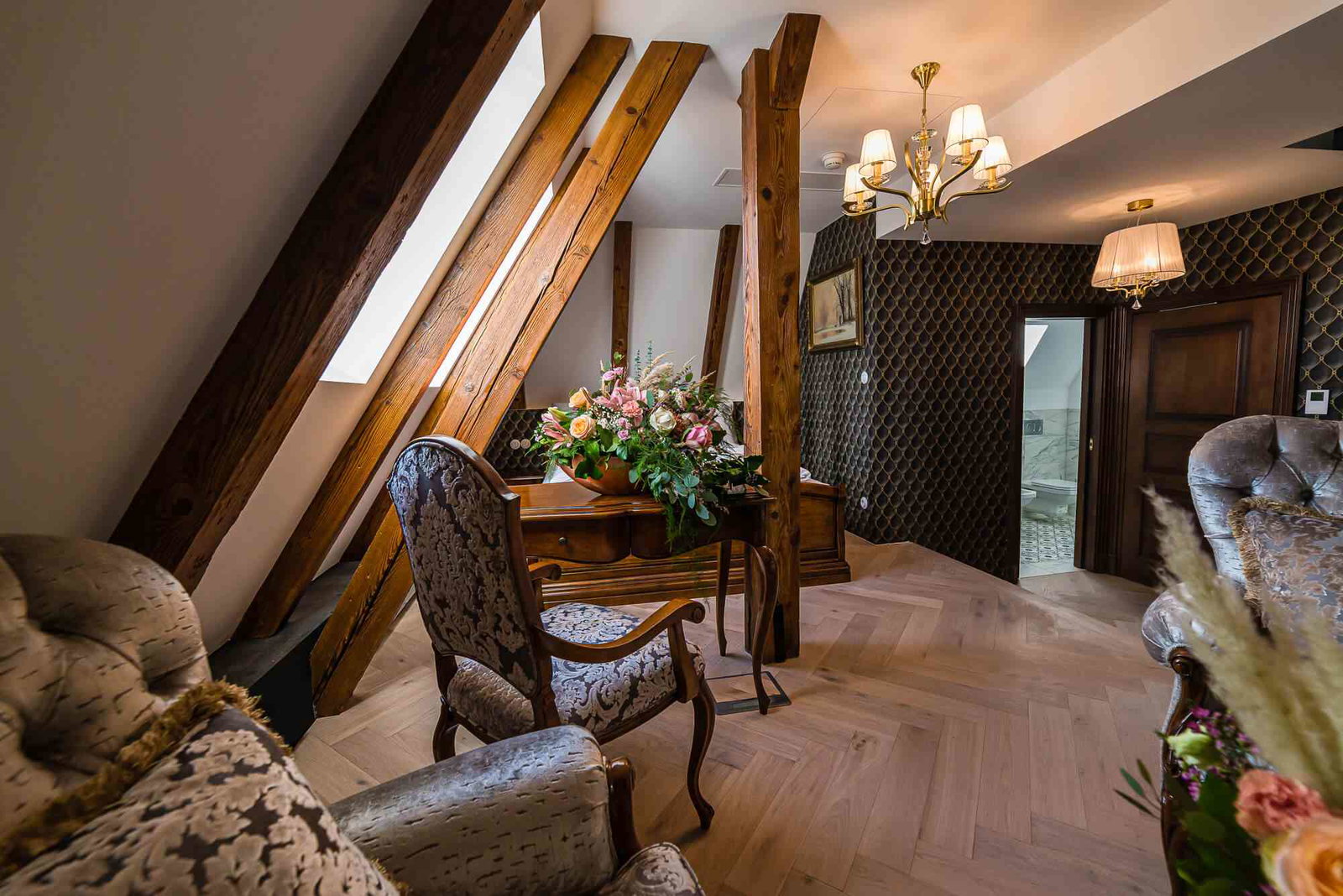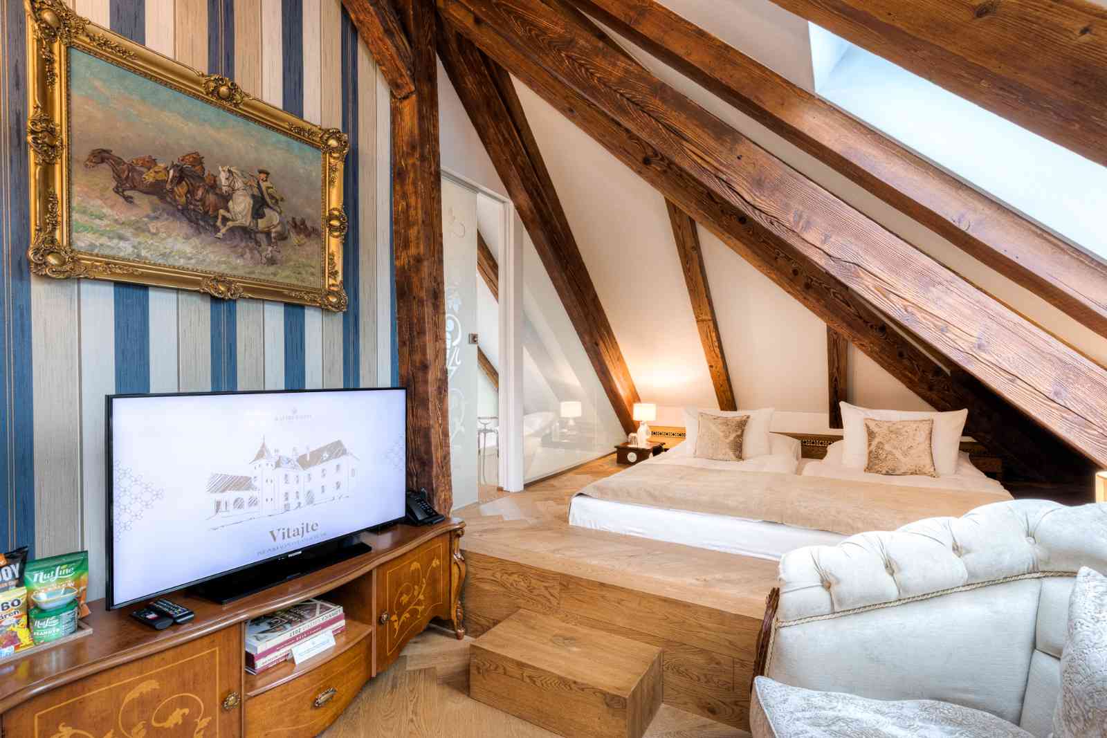 If you are seeking romance for two and wish to experience the love story of Katarína Pálffy and Štefan Ilešházi in the beautiful period-inspired Katarína Pálffy apartment, you have come to the right place. Our romantic, luxury apartment with a view of the Svätý Jur church is located in the attic section of Pálffy Manor.