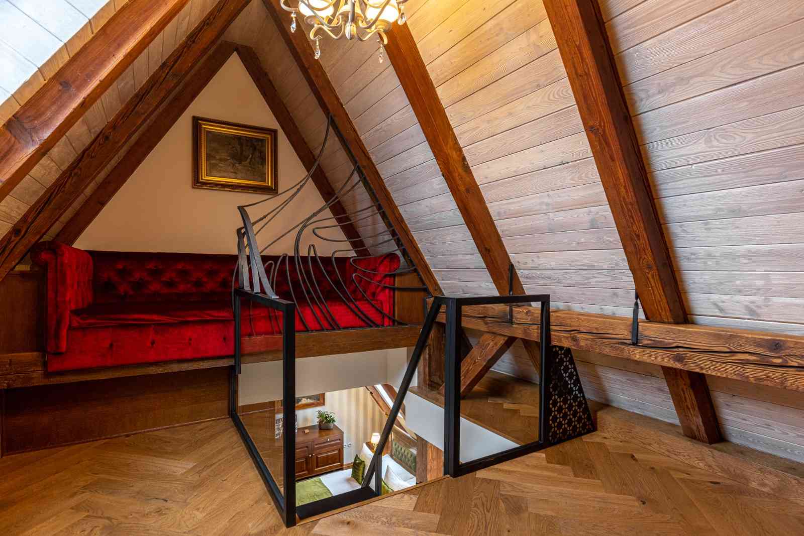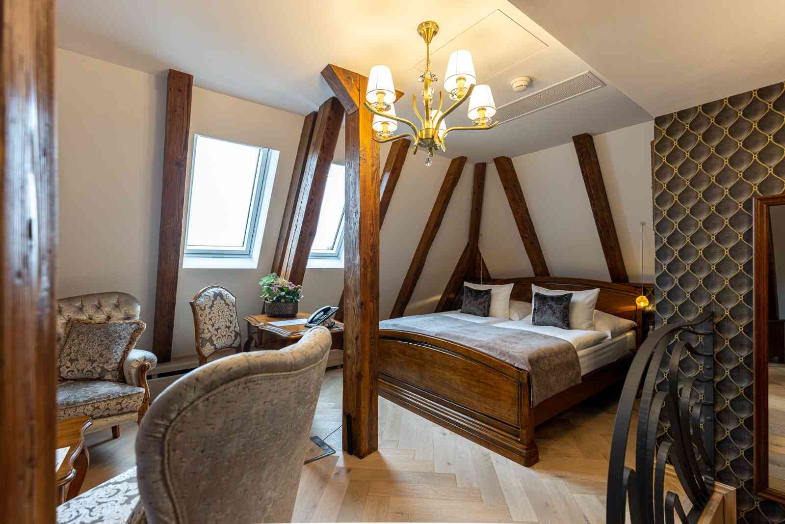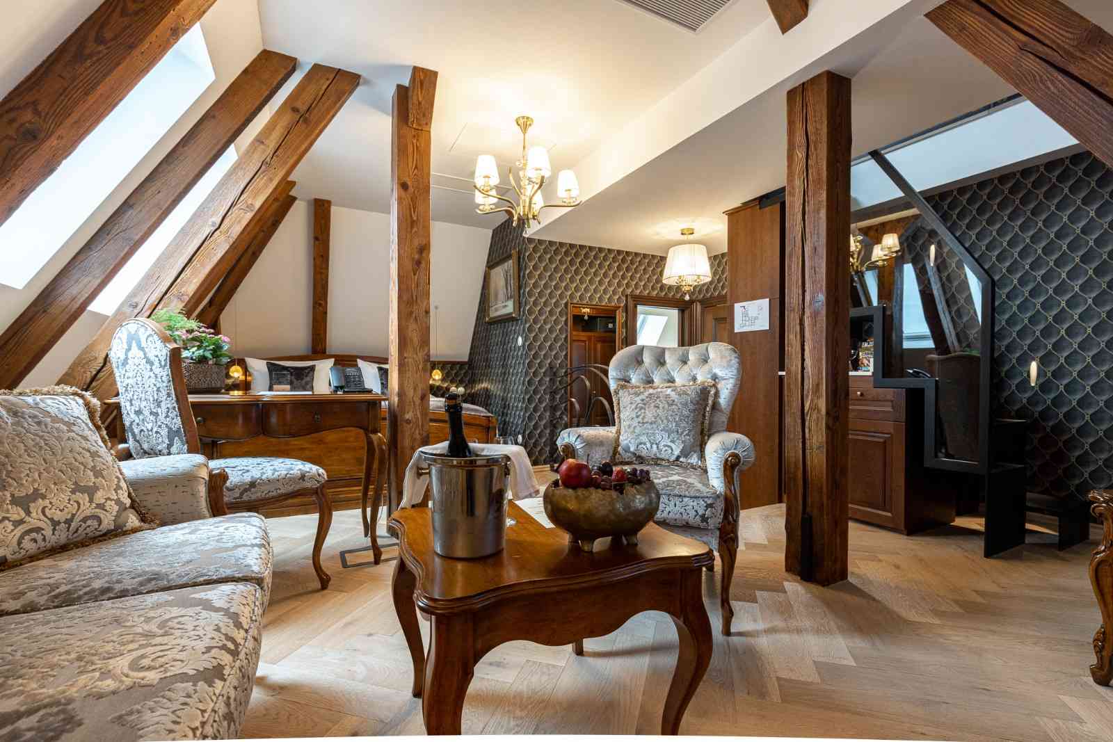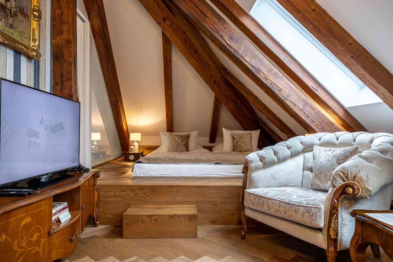 If you are seeking romance for two and wish to experience the love story of Katarína Pálffy and Štefan Ilešházi in the beautiful period-inspired Katarína Pálffy apartment, you have come to the right place. Our romantic, luxury apartment with a view of the Svätý Jur church is located in the attic section of Pálffy Manor.