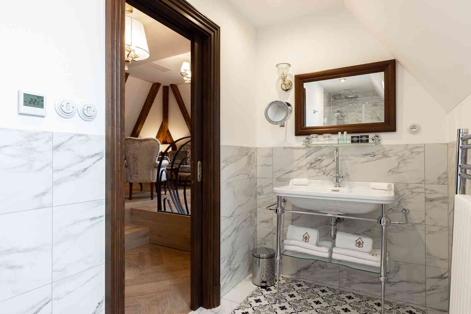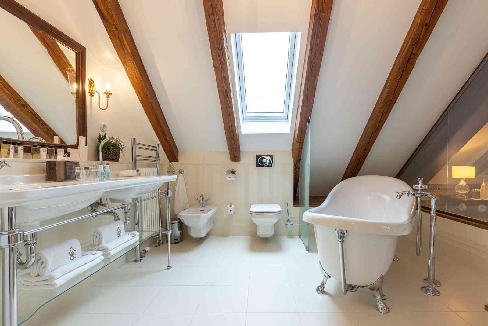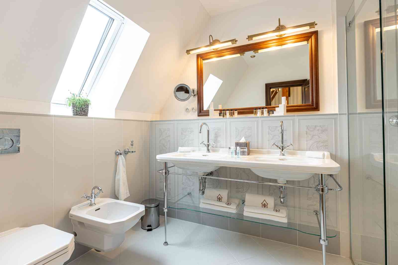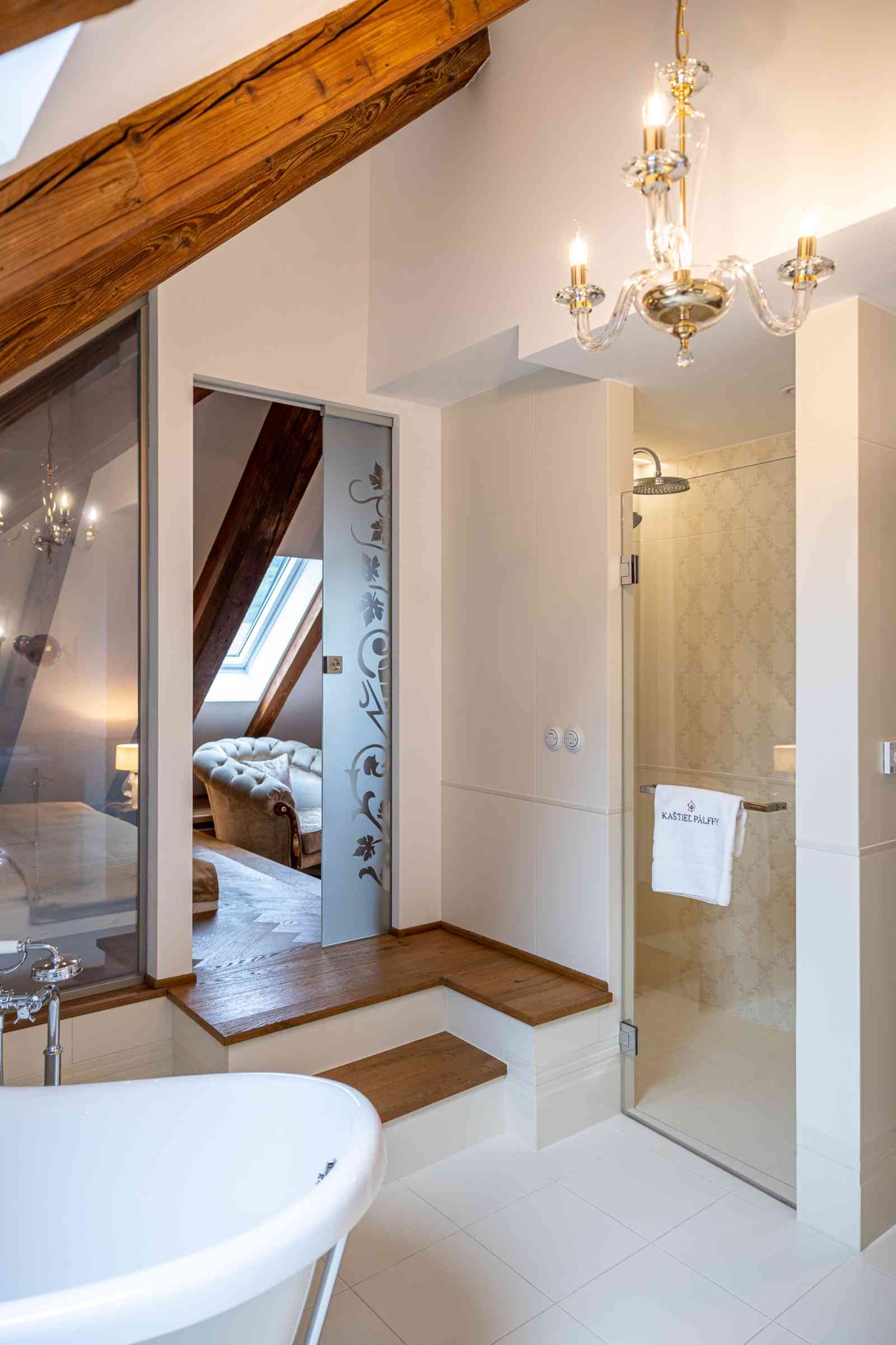 The private bathroom features a separate shower, WC, and bidet. Transport yourself to times past, relax with a glass of wine or a good book in the Štefan Ilešházi apartment at Pálffy Manor.