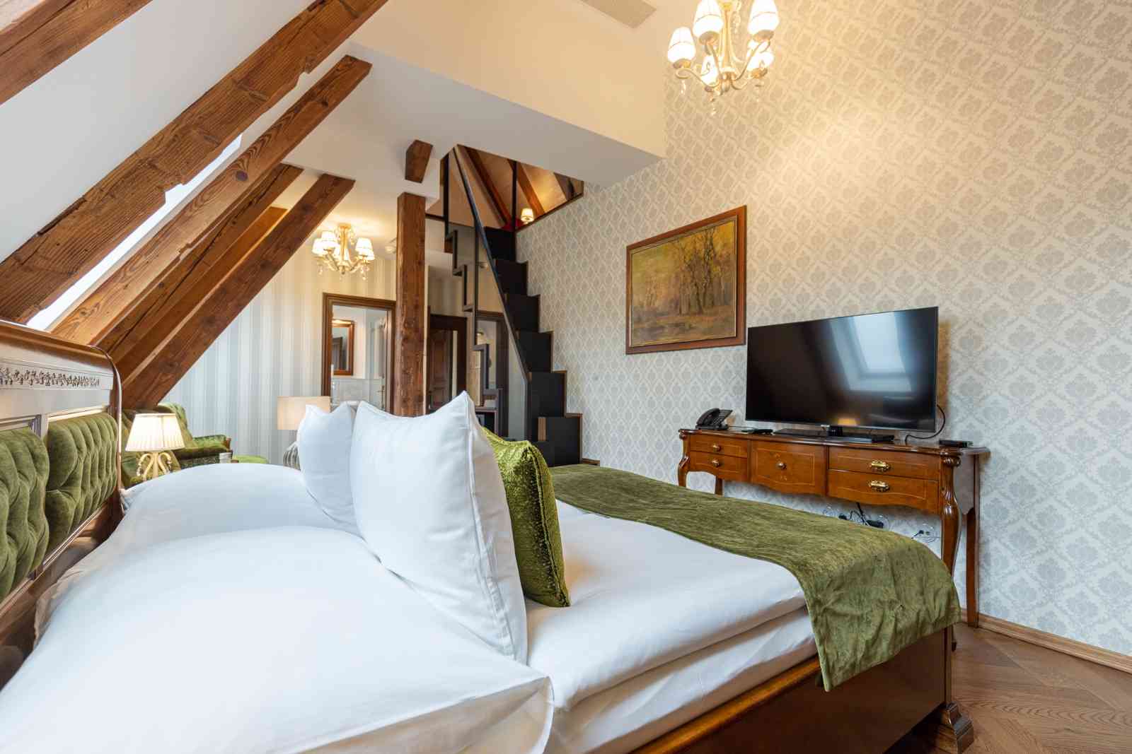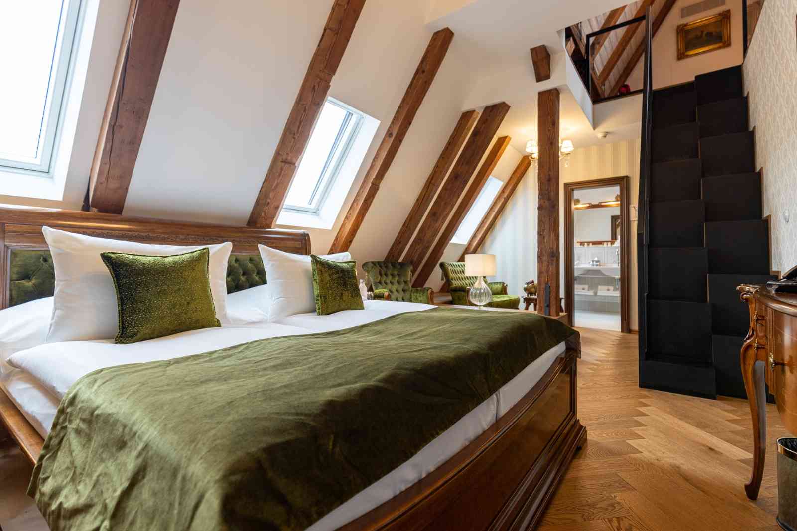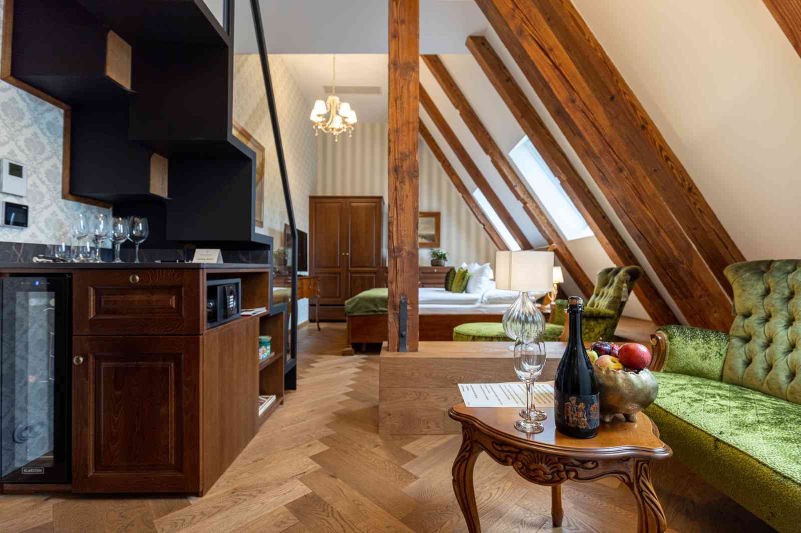 The apartment named after one of the most renowned owners of Pálffy Manor – Štefan Ilešházi – combines luxury accommodation with comfort, defined by an interior styled in shades of green. Our mezzanine apartment with a view of the Small Carpathian vineyards will enchant you with its spaciousness and tasteful design. Wooden beams framing silver wallpaper, period lounge seating, a King Size bed with fine silk linens, and solid wood furniture create a cozy yet unique atmosphere.