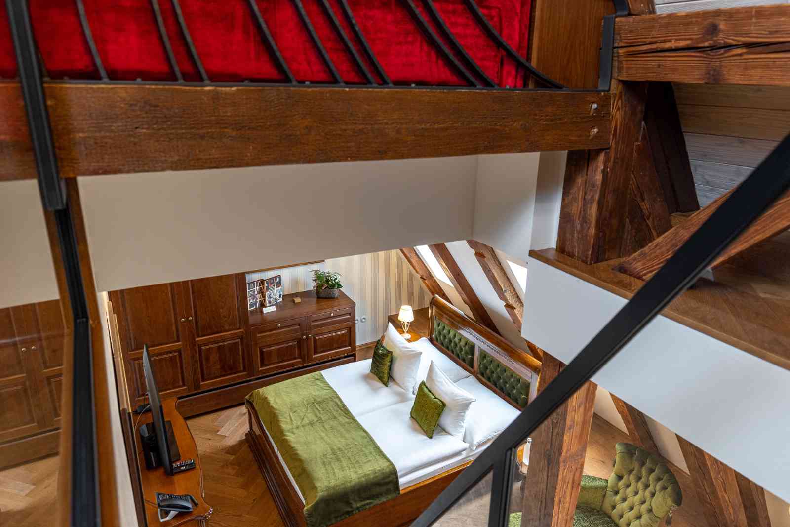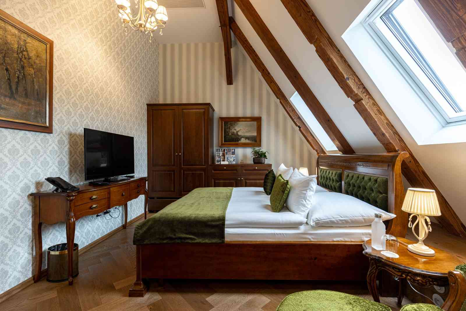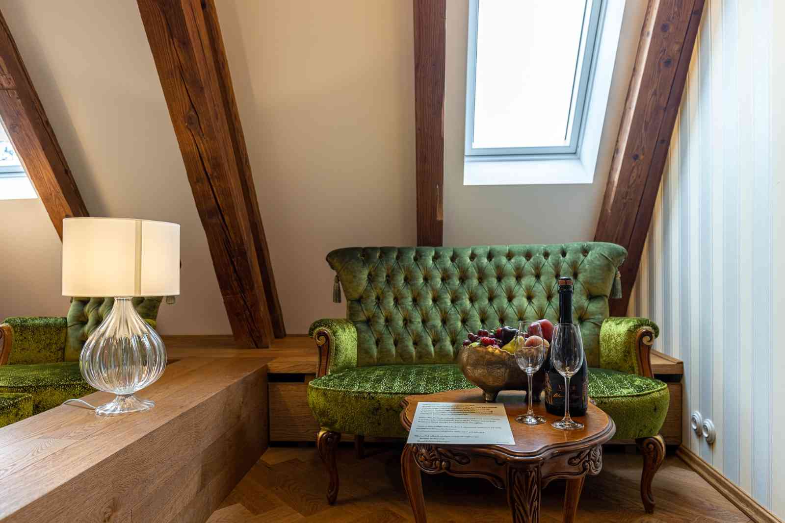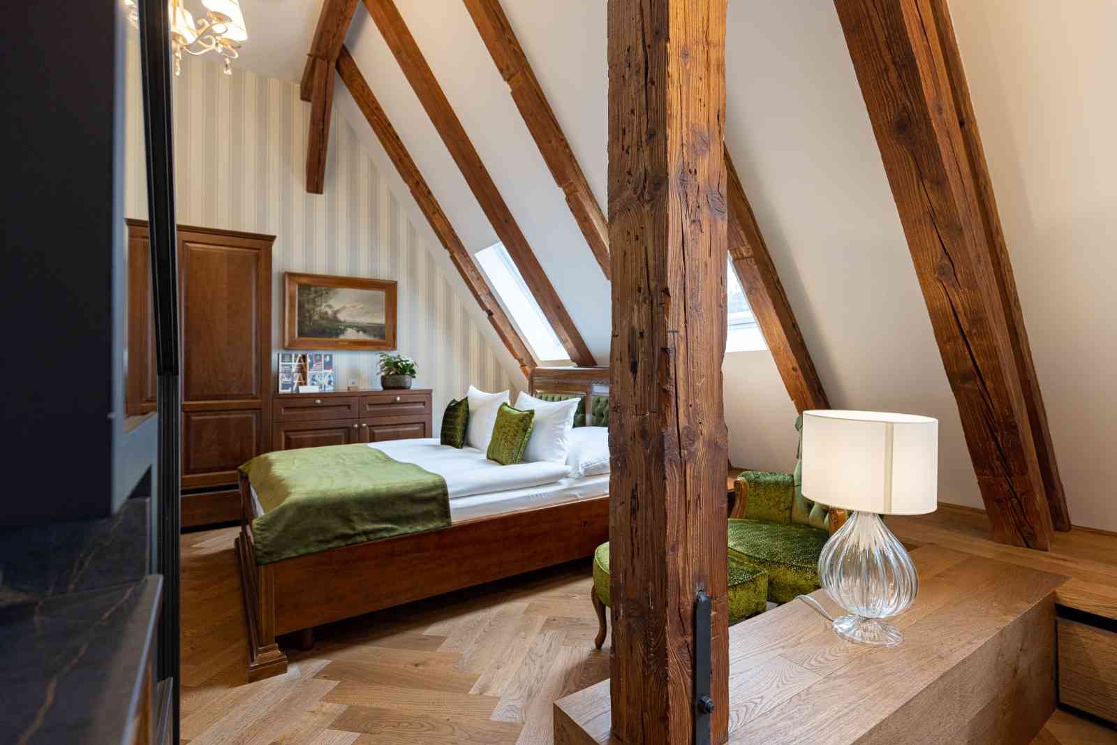 The apartment named after one of the most renowned owners of Pálffy Manor – Štefan Ilešházi – combines luxury accommodation with comfort, defined by an interior styled in shades of green. Our mezzanine apartment with a view of the Small Carpathian vineyards will enchant you with its spaciousness and tasteful design. Wooden beams framing silver wallpaper, period lounge seating, a King Size bed with fine silk linens, and solid wood furniture create a cozy yet unique atmosphere.