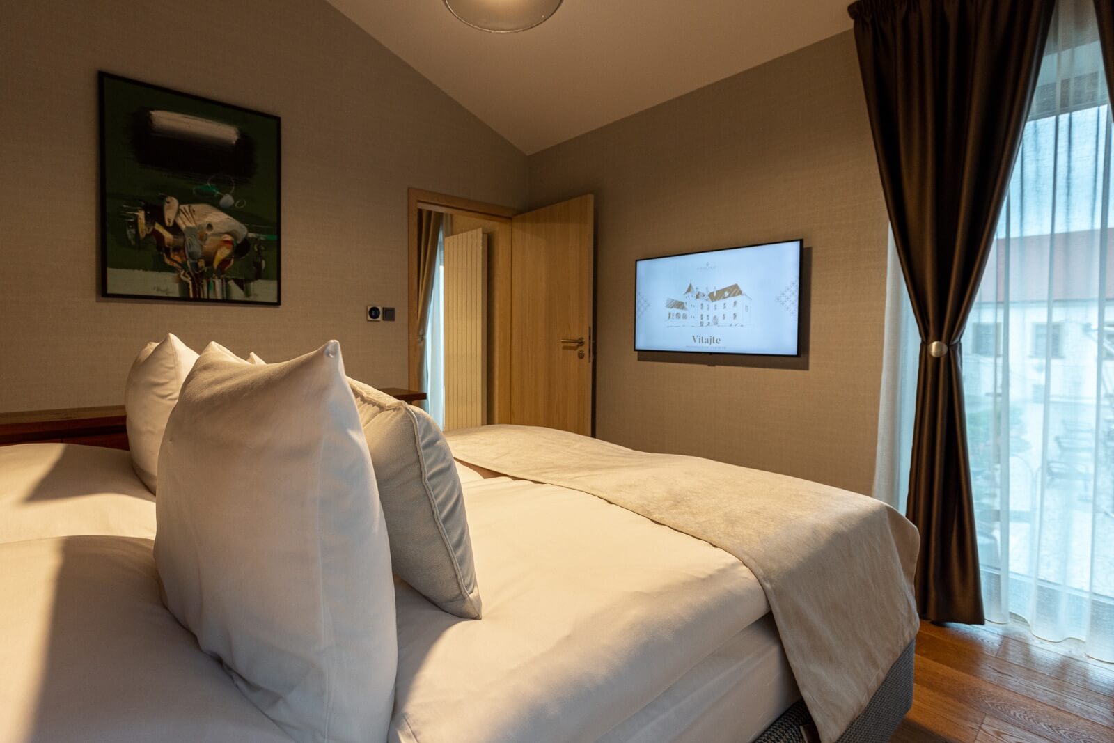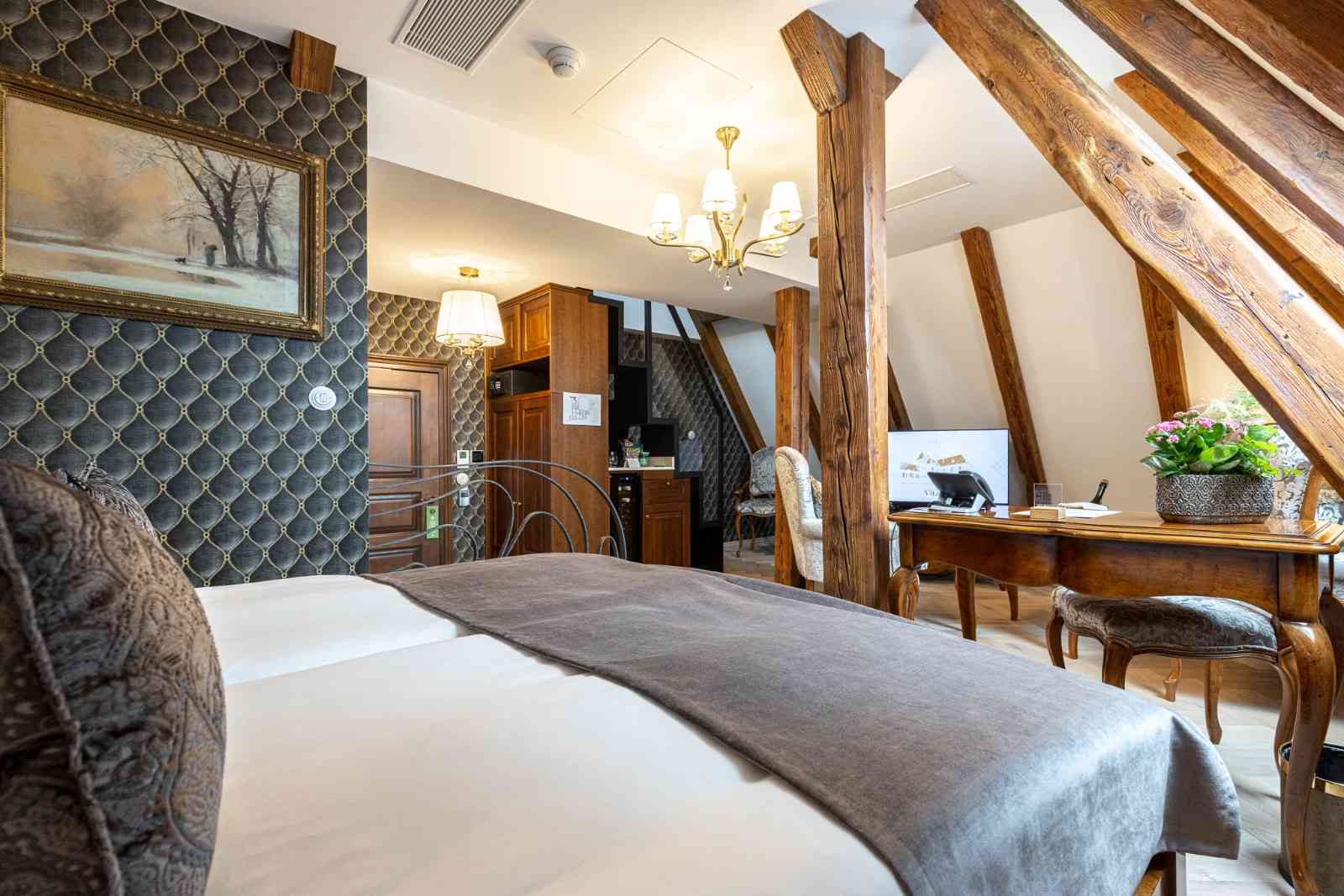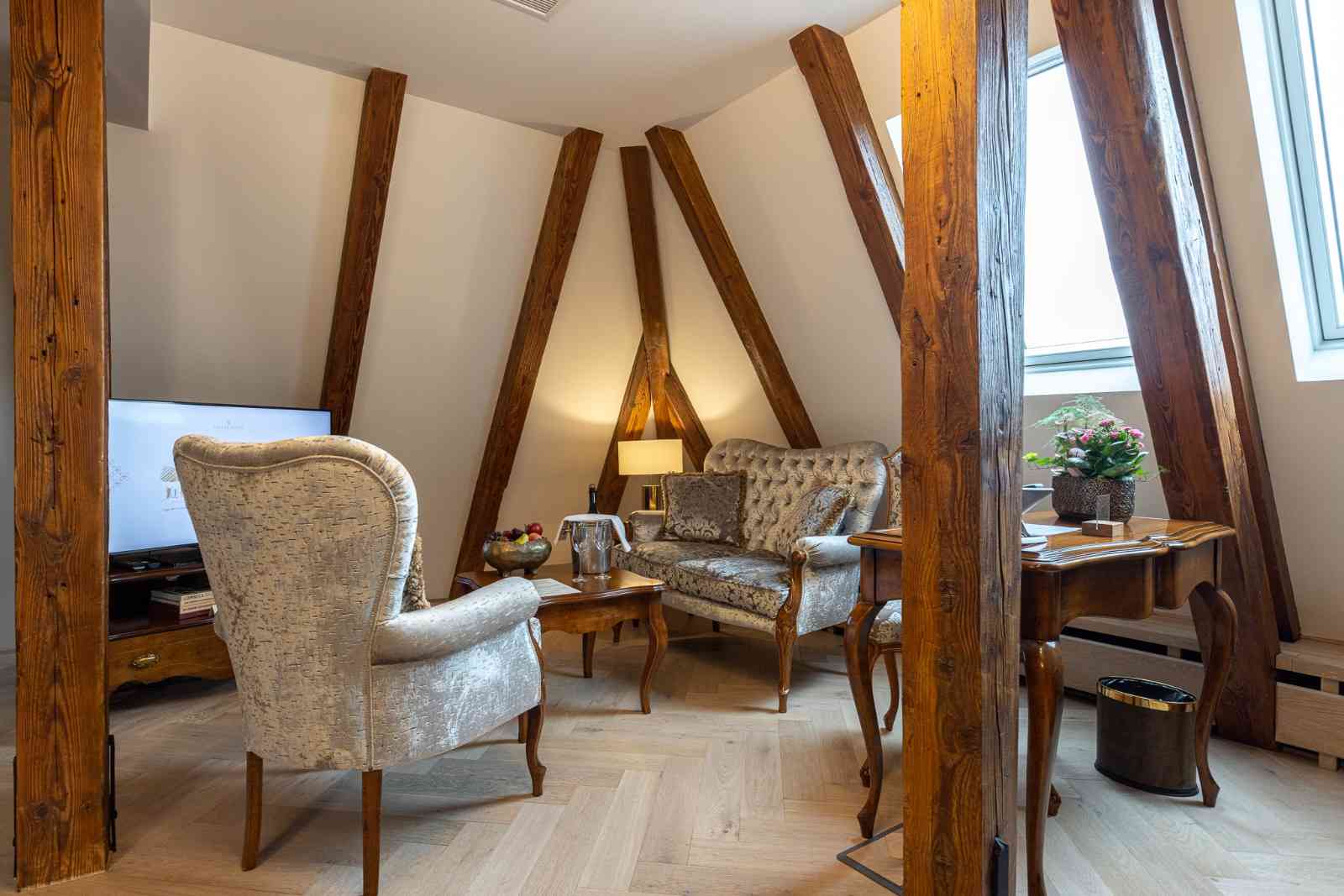 The elegant mezzanine Ján Krušič apartment features two separate beds on the upper level. It is suitable not only for two guests but also for families of four. Wooden beams and elegant period furniture harmonize with the overall interior, creating a sense of comfort and tranquility. For your maximum comfort, there is a spacious wardrobe, mirror, writing desk, sofa with armchairs, and a TV cabinet. The view offers the beauty of Svätý Jur vineyards.