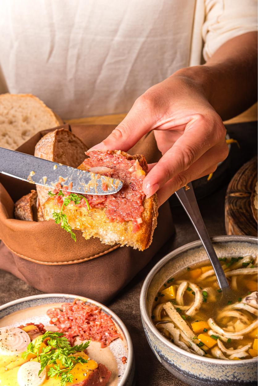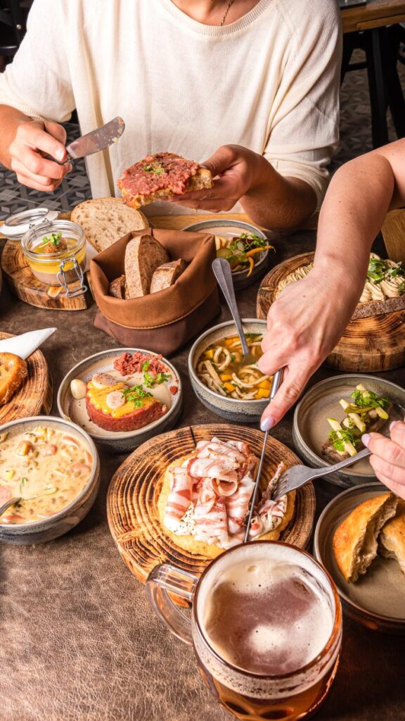 Koncept je postavený na vlastných remeselných pivách a jedlách, ktoré chuťovo doladia ponuku pivovaru Pálffy Brauerei. „Pri receptoch sme sa inšpirovali tradičnými jedlami, ktoré sa s pivom odjakživa spájajú, ale v našom menu hostia nájdu aj také špeciality ako pivný krémeš či pivný guláš. Tam kde sa čapuje skvelé pivo, nemôže poriadny guláš chýbať. Hostia ho u nás nájdu pripravený z jemných bravčových líčok, podlievaný našou 11-kou – Viedenským polotmavým ležiakom krásneho Otta,“ vysvetľuje Jaro Bachleda, šéfkuchár PaB Kuszmannov bazár, ktorý stojí za celým menu oboch reštaurácií. Kuchyni PaB-u Kaštieľ Pálffy bude kraľovať náš Head Chef Patrik Andrejčák, ktorý stál aj na čele reštaurácie Hostinec Palatín. „Aj v Hostinci Palatín sme sa zameriavali na rakúsko-uhorskú kuchyňu. V tom ideme pokračovať, hostia sa však môžu tešiť na jedlá viac ladené k samotnému pivu. Okrem pivných klasík ako tatarák či špecialít v podobe pivného gulášu, budeme mať v menu aj legendárny Tafelspitz – špecialitu rakúskej kuchyne,“ hovorí Patrik.