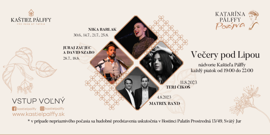 Stretneme sa pod našou vyše 300 ročnou lipou, ktorá je súčasťou histórie Kaštieľa Pálffy a spríjemníme si touto hudobnou atmosférou spoločný piatkový večer.